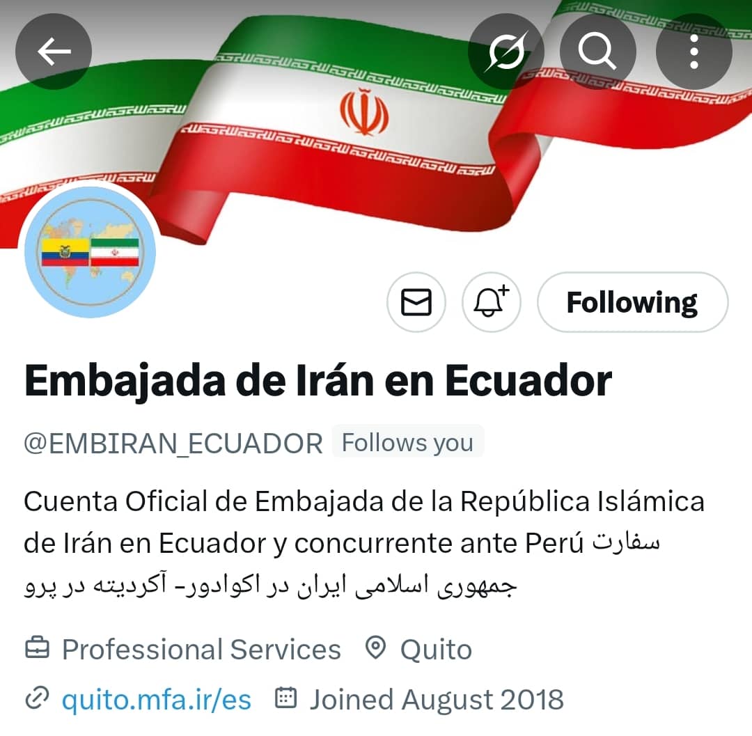 Les presentamos la cuenta Oficial de la Embajada de la República Islámica de Irán ante Ecuador en X: @EMBIRAN_ECUADOR